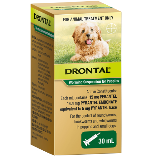 Drontal wormer for puppies 30ml. For the control of gastrointestinal worms in puppies and small dogs including Roundworms, Hookworms and Whipworms. Gentle on stomachs.