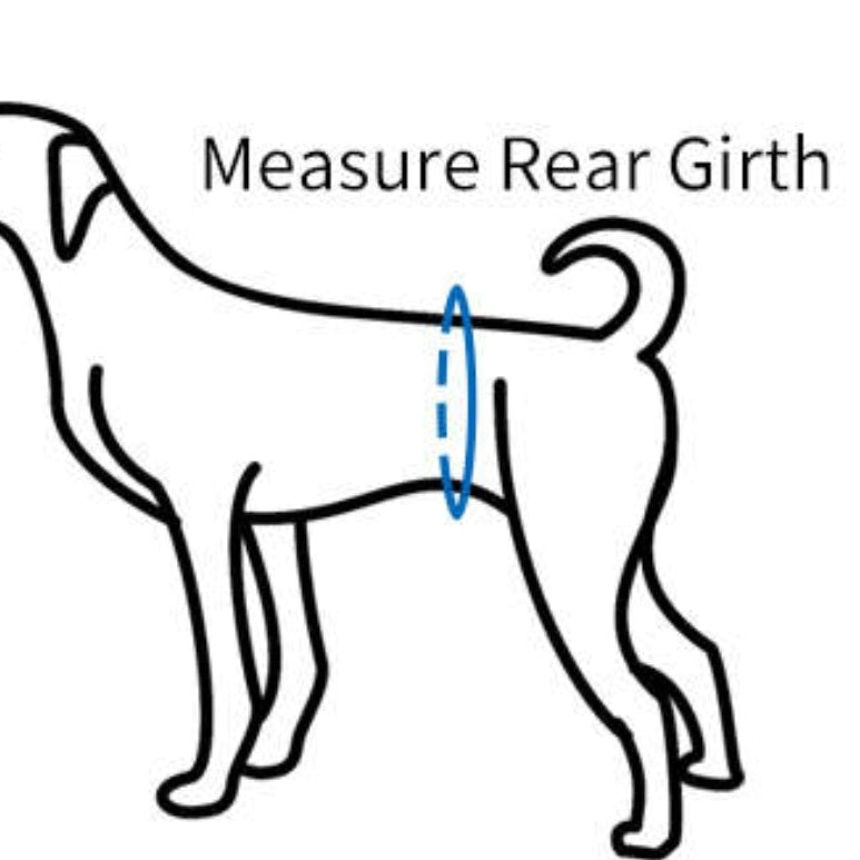 Please measure your bitch before ordering. Measure the total girth of your bitch just in front of the hind legs. Measurements below.
