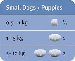 Dog weight 0.5 to 1kg - 1/2 tablet; Dog weight 1 to 5kg - 1 tablet