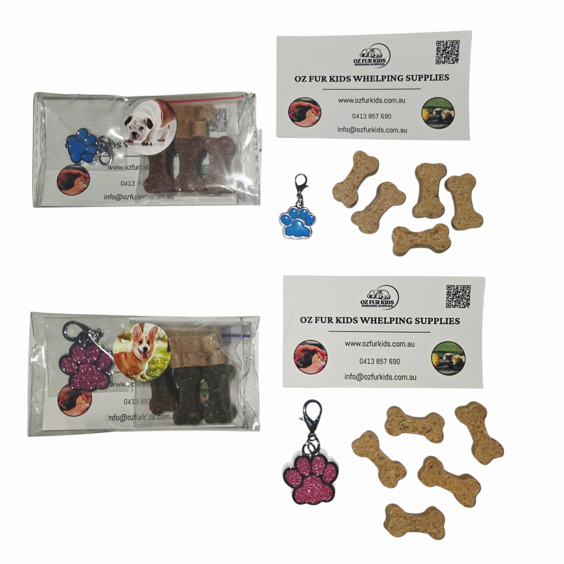 These Puppy Gift Packs are available with a Regular or a Large sized Paw Charm and are a fantastic addition in puppy packs. They contain an enamel paw charm, irresistable Aussie made wheat free Micro Bone Treats and a fridge magnet of our website full of quality KONG, Nylabone and other puppy toys, chews and ongoing puppy care products.