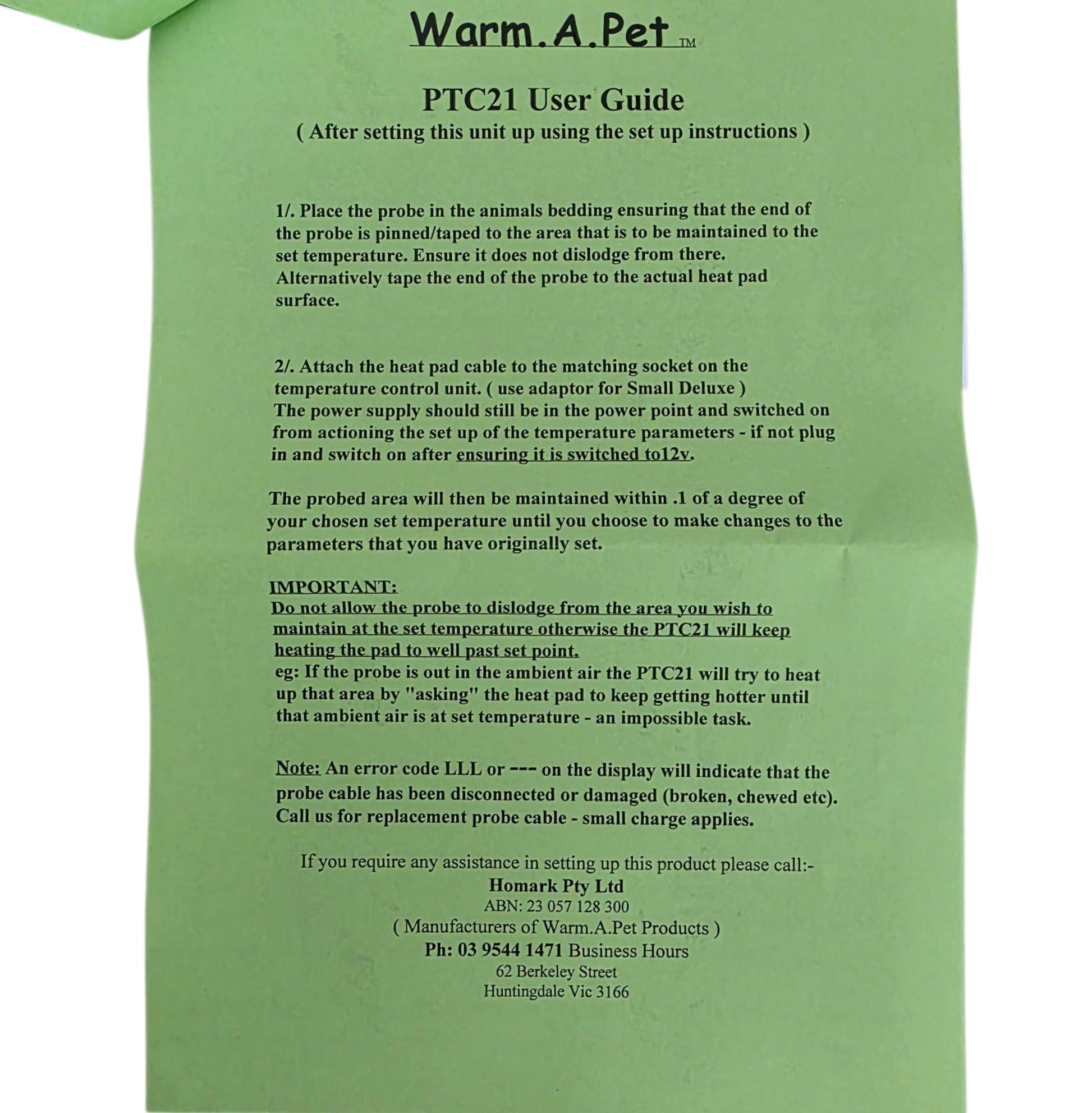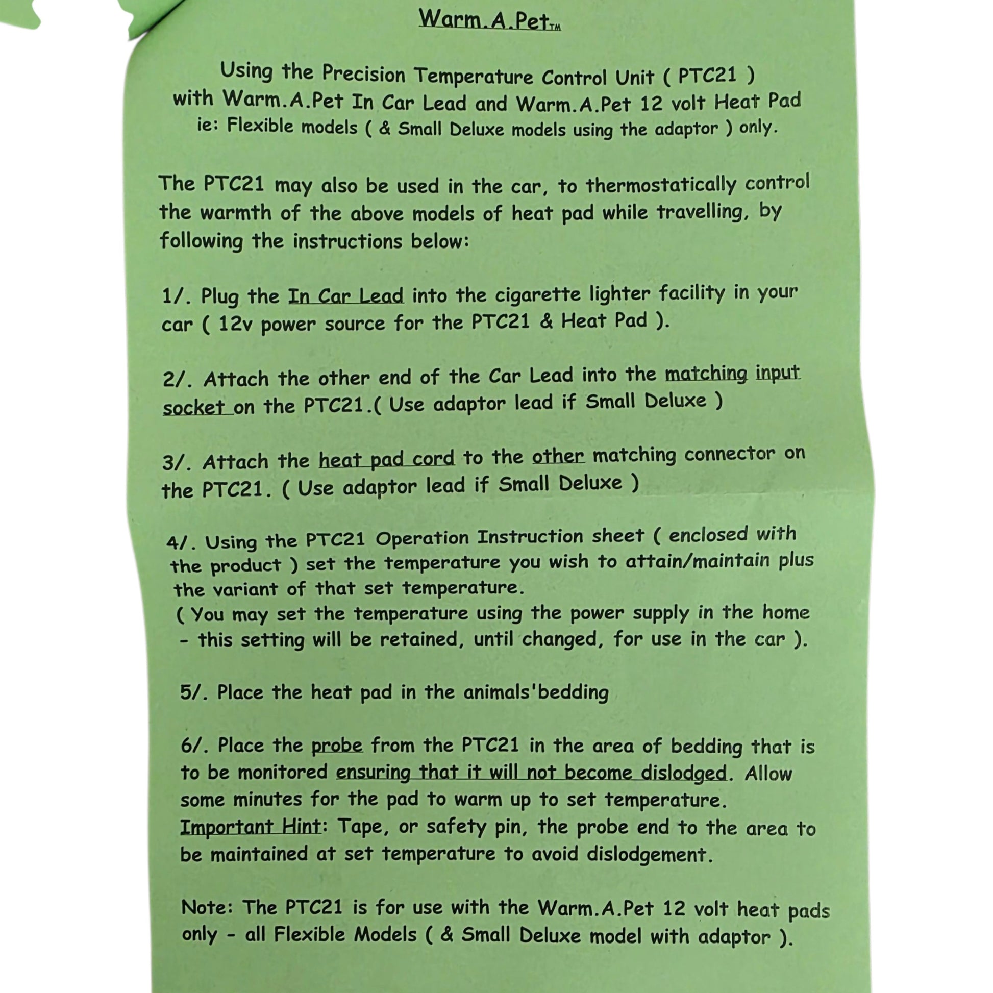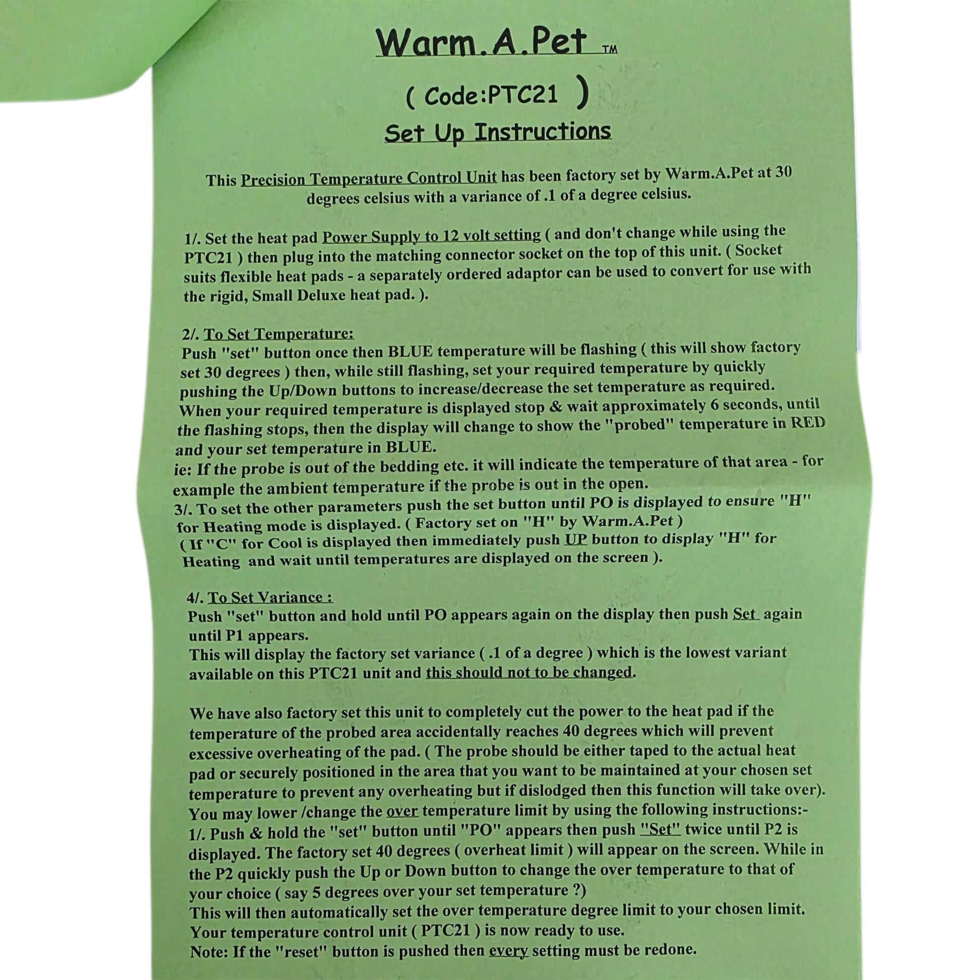 The Warm.A.Pet Precision Thermostat Control Unit is used in conjunction with the Warm.A.Pet heat pad (sold separately). The Precision Thermostat Control Unit maintains the chosen set temperature of the (say 30 degrees) and the variance can be set to 0.3 of a degree.